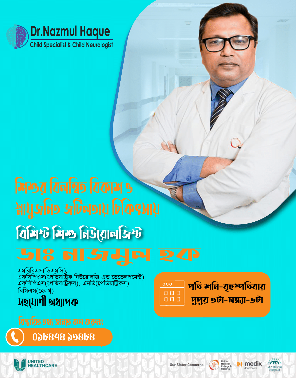 - ডা: নাজমুল হক, আগামী মাসের ১২ তারিখে (ডিসেম্বর ২০২৫) শুক্রবার, কুমিল্লা বিকাল ৬টা হতে রাত ৯টা পর্যন্ত চেম্বার করবেন। প্রতিমাসে শেষ সোমবার আগারগাঁওতে ন্যাশনাল ইনস্টিটিউট অব নিউরোসায়েন্সেস হাসপাতালে ১১২ রুমে দুপুর ৩:০০ টা থেকে সন্ধ্যা ৬:০০ টা পর্যন্ত সরকার নির্ধারিত ফি (৩০০ টাকায়) ডাঃ নাজমুল হক রোগী দেখেন। সিরিয়ালের জন্যঃ (চেম্বার সহকারী ০১৮২৭৫৬৬৫৮০)